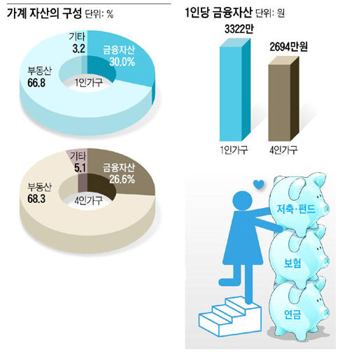 나 홀로 가구가 500만명에 육박하면서 재테크 패러다임에도 변화의 물결을 일으키고 있다. 재테크의 중심축을 부동산 일변도에서 연금 등 금융자산으로 바꾸는 데 솔로족의 기여가 크다. 과거 다인(多人) 가구의 가장들은 방 3~4개짜리 아파트를 주거용으로 사들여 노후 대비 재테크까지 겸하는 경향이 강했다. 아파트는 높은 시세 차익을 안겨줘 노후 걱정을 덜어주었다. 이런 투자 패러다임 탓에 우리나라 가계는 전체 자산 중 부동산이 70% 이상을 차지하는 기형적 구조를 갖게 됐다. 그러나 노후에 돌봐줄 가족이 없는 'S족'은 부동산에 대한 관심이 상대적으로 적다. 은퇴 후 꼬박꼬박 현금이 나오는 연금 등 금융자산을 선호하는 경향이 다인 가구에 비해 강하다. ◇금융자산을 선호하는 1인 가구 ◇1인 가구의 탈(脫)부동산 현상 ◇노후 대비 연금 필요 [방현철 기자]