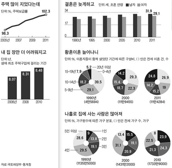 집은 많이 지었다는데 내 집 장만은 갈수록 어려워진다. 초혼 연령은 높아지고 결혼 20년차 이상 부부가 헤어지는