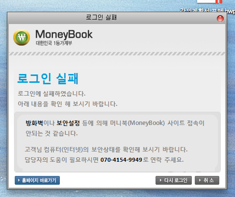 머니북을 유용하게 사용하다가, 학교에서 일괄적으로 보안 설정을 강제적으로 변경하면서 머니북 로그인이 안됩니다. 첨부파일과 같은 메세지가 뜨네요...