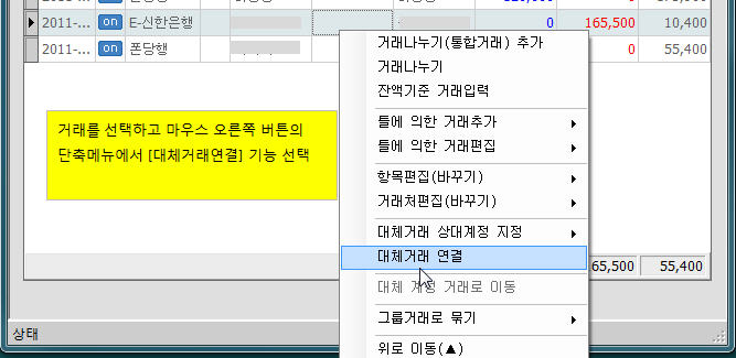 거래를 선택하고 마우스 오른쪽 버튼을 누르면 [대체거래연결] 기능이 있는데 이것을 선택 합니다.