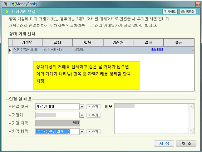 [3] 차액이 있을 경우 차액을 표시 합니다. 예를 들어 A은행에서 B은행으로 계좌이체를 하였을 때 발생하는 송금수수료 같은 것인데 차액은 별도의 거래로 나누어서 기록이 됩니다.