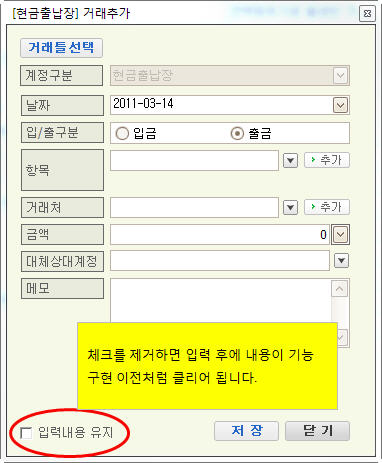 >박선영씨 질문에 대한 추가입니다. 저도 현금거래가 많아 추가 입력할 때, 입력내용 유지 체크해지를 해도 그대로 유지가 되어 불편함을 느낌니다. 머니북 답글은 효과가 없더라구요! 제가 잘못 사용할까요??