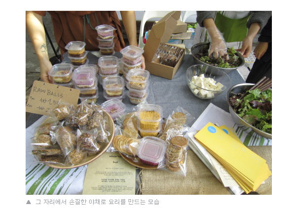 도시농부와 요리사가 함께 만드는 도시장터 <마르쉐@> 지난 13일 혜화동에서 열린 이 행사는 여성환경연대, 마리끌레르, 문화예술위원회 아르코미술관이 공동주최한 도시장터다. 성북동의 할머님들이 텃밭에서 일군 야채, 그리고 도심 곳곳의 빈 공간이나 건물의 옥상을 텃밭으로 활용해 재배한 먹을거리를 요리사가 음식으로 만들어 함께 나누는 장이다. 주먹밥과 핑거 푸드로 진화시킨 사찰음식 같은 먹거리 외에도 각종 잼과 드레싱, 다양한 종류의 쿠키와 각종 빵들, 수제양갱, 아이스크림, 요구르트 같은 디저트와 각종의 신선한 채소 과일 주스와 차들, 알록달록한 빛깔의 각종 장아찌와 피클, 드레싱, 말린 나물 같은 건강하고 계절이 담긴 느린 음식들이 있었다. [박은영(eypark1942)]