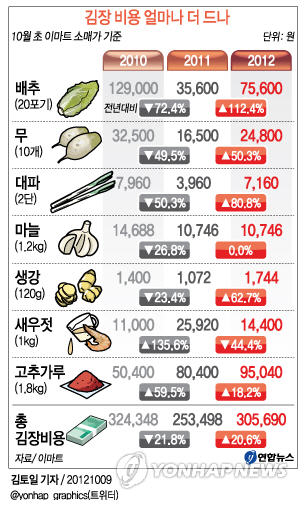 유통업계에 따르면 4인 가족이 김장을 담글 경우 김장에 들어가는 비용은 지난해(18만7천930원)보다 22.3% 더 비싼 22만9천750원이 들 것으로 예상돼 주부들의 한숨이 깊어질 것으로 보인다고. [장예진 기자]