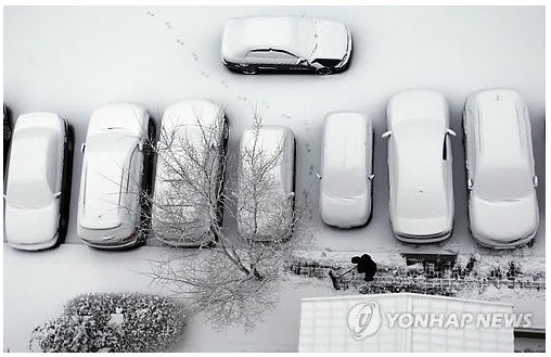 첫눈이 내린 강원 춘천시내의 한 아파트단지에서 관리소 관계자가 제설작업을 하고 있다. 춘천의 첫눈은 지난해보다 3일 빠르다고. [이해용 기자]