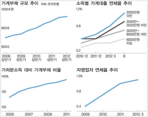 경기침체가 지속되면서 저소득층의 채무상환능력은 떨어지고 있다. 저소득층의 제2금융권 대출이 증가하고 있고 최근 들어선 신용등급이 우량한 저소득층의 생계비 마련용 대부업 대출도 빠르게 확대되고 있다. 전체 대부업 대출 가운데 1~6등급 비중이 2010년 32.2%에서 올해 상반기 41.9%까지 상승했다. 대부업은 법정 최고금리 39%를 받기 때문에 소득여건이 나아지지 않을 경우 부실위험이 크게 높아질 가능성이 있다. 저소득 계층의 부실화율도 빠르게 상승하고 있다. 연소득 2000만원 미만 대출자의 연체율은 지난해말 0.6%에서 지난 8월말 1.1%로 늘어났다. 저신용등급(7~10등급) 대출자의 신용카드 대출 연체자는 지난해말 36만6000명에서 지난 5월말 48만2000명으로 늘어났다. 임대아파트 임대료 체납자도 증가하는 추세다. 한국은행은 최근 발표한 금융안정보고서에서 “최근 가계의 채무상환부담이 커지고 수도권을 중심으로 한 주택시장 부진이 지속되면서 일부에서 ‘부채-디플레이션’ 발생 가능성에 대한 우려가 나오고 있다”고 진단했다. [김희연 기자]