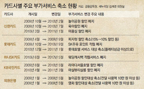 신용카드사들이 2009년 이후 내놓은 부가서비스 10개 중 4개는 1년 안에 폐지되거나 서비스 내용이 대폭