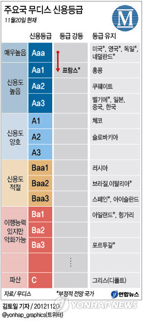 국제 신용평가사 무디스는 프랑스의 국고채 등급을 최고등급이던 기존 Aaa에서 Aa1으로 한 단계 하향 조정했다고