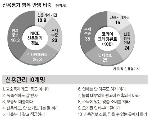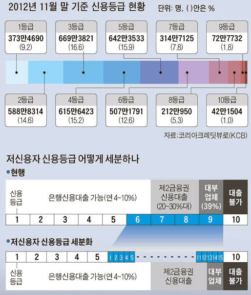 한국의 신용등급 체계가 유난히 경직돼 있다는 지적이 많은데 내릴 때는 '급행', 오를 때는 '완행'이다. 대출금 상환이나 카드 결제의 경우 5일만 연체되면 신용등급이 강등된다. 예컨대 비교적 우량인 3등급인 사람이 7등급으로 떨어지는 데는 한 달이 채 걸리지 않을 수 있다. 반면 연체된 대출금이나 카드 결제액을 갚더라도 신용등급이 원상회복 되기까지는 3~5개월이 소요된다. 7~10등급은 저신용자로 분류돼 은행 대출은 물론 신용카드 신규 발급이 사실상 어려워진다. 이들이 대출을 받으려면 제2금융권에서 연 20%가 넘는 금리를 물어야 한다. 5, 6등급인 사람들도 은행이 신규 대출 심사를 할 때 연 10% 이상의 고금리를 매기거나 대출을 거절할 수 있다. 금융소비자단체들은 현재 신용등급 체계가 금융소비자보다 금융회사에 일방적으로 유리하게 만들어졌다고 비판하는데 금융소비자연맹 강형구 사무국장은 "신용등급 산정방식이 금융회사가 돈 떼이지 않는 데 초점이 맞춰져 있다. 이 때문에 신용등급을 빨리 내리고 천천히 올린다"고 말했다. [이태경, 홍상지 기자]