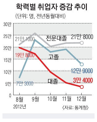 “대학까지 나왔는데 아무 데나 갈 수도 없고…. 대학 졸업장이 오히려 취업 걸림돌로 느껴질 때도 있습니다.” 다음 달 서울 지역 4년제 대학을 졸업할 예정인 전모(25/여/경기 고양시 일산구)씨는 10일 “취직이 아직 안 돼 불안하다”며 이렇게 말했다. 전씨 같은 대졸 구직자의 취업난이 외환위기 이후 가장 심각한 것으로 나타났다. 통계청의 ‘교육정도별 취업자 수 분석’ 자료에 따르면 지난달 대졸 취업자 수는 1년 전보다 3만 4000명 늘어나는 데 그쳤다. 이는 1999년 12월(3만 1000명) 이후 13년 만에 가장 작은 규모다. [김양진 기자]
