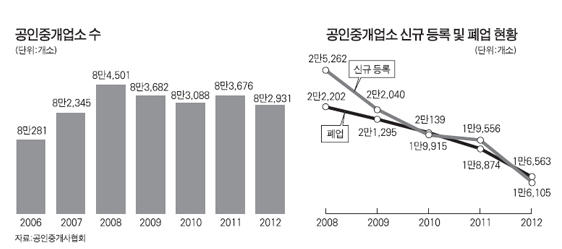 1960년대 본격적인 경제개발이 시작된 이후 50여 년간 지속돼 온 부동산 생태계가 급격히 무너지고 있다. 글로벌 금융위기 여파로 주택 거래량이 계속 줄어들면서 공인중개사와 인테리어업체, 이삿짐센터 등 주택거래 관련 생계형 업종에 종사하는 서민들이 한계 상황에 직면하고 있는 것이다. 이들 업종 종사자는 약 70만 명으로 추산된다. [배성재 기자]