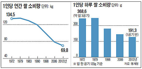 쌀 소비량이 계속 줄어들고 있다. 통계청은 31일 "지난해 1인당 연간 쌀 소비량이 70㎏ 밑으로 떨어지면서 30년 전의 절반 수준으로 떨어졌다"고 밝혔다. 1인당 연간 쌀 소비량은 1979년 135.6㎏을 정점으로 지속적으로 줄어들다가 지난해엔 69.8㎏까지 떨어졌다. 지난해 한국인의 하루 평균 쌀 소비량은 191.3g으로 밥 한 공기 반 분량에 그쳤다. 한 끼에 반 공기 정도만 밥을 먹는 것이다. 통계청 관계자는 "밥을 대체할 수 있는 식품이 계속 개발되는 데다 가공식품이 다양해지면서 식생활이 간편해져 쌀 소비량이 계속 감소하고 있다"면서 "현재 추세대로라면 10년 정도 지나면 하루에 한 공기 정도로 줄어들 것"이라고 내다봤다. 탄수화물을 과다하게 섭취하면 건강에 좋지 않다는 인식도 소비량 감소에 일조하고 있다. [박유연 기자]