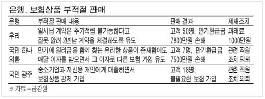 은행들이 판매하는 보험상품(방카슈랑스)을 제대로 설명하지 않거나 일명 `꺾기`에 이용하다 무더기로 적발됐다. 금융감독원은 지난달 31일 지난해 6개 시중은행을 대상으로 방카슈랑스 영업행위를 검사한 결과 우리은행과 국민 하나 외환은행에서 부적절 판매 사실을 적발하고 제재 조치를 했다고 밝혔다. [김선걸, 이진명 기자]
