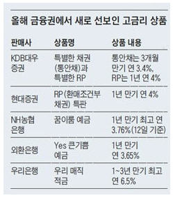 고금리 실종시대다. 전국은행연합회에 따르면, 시중은행의 1년 만기 예금의 금리는 2.4~3.3%, 적금 금리는 2.5~3.5% 정도이다. 6~7%대 이자를 줘 인기를 끌었던 저축은행의 고금리 예금상품도 옛말이 된 지 오래다. 일부 금융사들은 4%대 금리를 주는 특판(특별판매) 상품을 내세워 떠돌이 투자자들을 붙잡고 있다. ◇증권사 4%대 특판 채권으로 투자자 유혹 ◇은행은 특판예금/우대금리로 고객 붙잡기 [유한빛 기자]