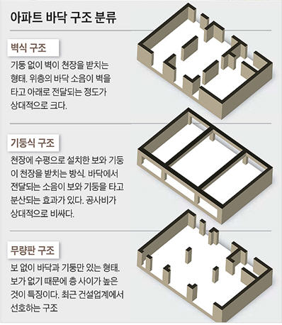 아파트 층간 소음이 살인까지 불러 사회적 논란이 되고 있는데 2006년 이전에 지은 아파트 620여만 가구는 사실상 층간 소음에 무방비 상태인 것으로 나타났다. 전국 아파트의 70%에 육박하는 수준이다. 2006년 이전에 지은 아파트의 바닥 콘크리트 두께는 요즘 지은 아파트보다 30%쯤 얇은 150㎜ 안팎에 불과한 탓이다. 문제는 층간 소음을 확실히 줄이려면 85㎡ 아파트 기준으로 업계 추산 1000만원 이상이 들어 비용을 감당하기 힘들다는 것이다. ◇기둥식 아파트 소음 차단 효과적 ◇소음 줄일 수 있지만 비용이 문제 [박수찬, 정한국 기자]