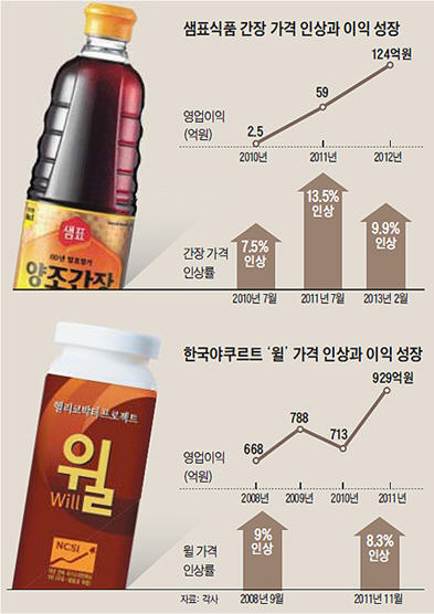 지난 15일 대형마트에 납품하는 간장값을 평균 9.9% 올린 샘표식품은 2010년 이후 세 번 가격을 인상했다. 3년치를 따져보면 매년 평균 10% 이상 가격을 올렸다. 지난 3년간 물가상승률이 2~4%대에 머물렀던 것을 감안하면 엄청난 인상률이다. 이 과정에서 샘표식품 매출은 2010년 1960억원에서 지난해 16% 늘어난 2270억원으로 늘었다. 같은 기간 영업이익은 2억5000만원에서 작년에는 그 50배인 124억원으로 폭증했다. 가격을 올리면 매출이 떨어지는 것이 일반적인 시장경제 원칙이지만, 국내 간장 시장의 사정은 다르다. 샘표식품이 50% 이상을 점유하고 있는 독과점 시장이기 때문이다. ◇독과점 식품업체, 폭발적 성장세 ◇기본 바탕 원인은 독점 ◇식품 정책 시각 바꿔야 [정성진 기자]