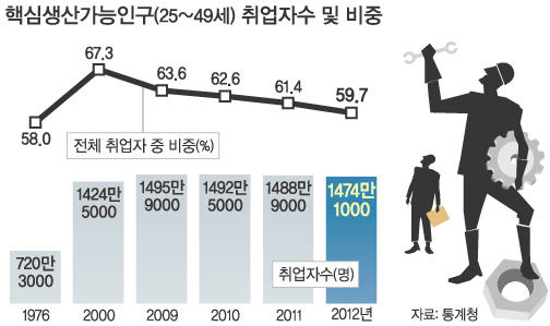 전체 취업자 중 경제활동의 허리역할을 담당하는 ‘핵심생산가능인구(25∼49세)’의 비중이 지난해 36년 만에 최저치를 기록했다. 2009년부터 4년 연속 줄었다. 핵심생산가능인구 자체가 감소한 탓도 있지만, 경기침체로 대졸자의 구직난이 심해진 것 등이 취업자 감소를 초래했다. 핵심생산가능인구는 경제활동의 중추를 담당한다. 노동생산성이 가장 높은 계층으로 소비지출도 왕성하다. 이 연령대 인구의 활동이 저하되면 경제는 활력을 잃게 되고 성장잠재력은 떨어질 수밖에 없다. 취업 감소가 두드러진 20대 후반이나 30대 후반을 겨냥한 맞춤형 교육과 일자리 정책이 절실하다. [이귀전 기자]