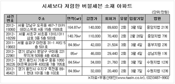 경매의 장점은 시세보다 싼 값에 주요 인기지역 아파트까지도 살 수 있다는 점이다. 특히 최근엔 서울을 비롯한 수도권의 이른바 '버블세븐' 소재 아파트도 저렴한 가격에 경매 물건으로 속속 나오고 있다. 다음달 4일 경기 성남지원1계에선 분당구 구미동 221번지(무지개로 144) '무지개아파트' 85㎡(이하 전용면적) 3회차 경매가 진행되는데 감정가는 4억6000만원이며 이번 최저가는 2억9240만원(64%)이다. 다음달 7일에는 수원지법 12계에서 용인시 수지구 죽전동 89-1번지(죽전로 246) '현대아파트' 85㎡의 3회차 경매가 진행되는데 감정가는 3억2000만원으로, 최저가는 2억480만원(64%)다. 서울 중앙지법21계에선 다음달 5일 강남구 도곡동 467-7번지(남부순환로 2804) '아카데미스위트' 164.9㎡가 3회차 경매(감정가 14억원, 최저가 8억9600만원)를 실시한다. 같은 달 4일에는 동부지법2계에서 송파구 마천동 31-1 '씨티' 84.98㎡의 4회차 경매(감정가 4억2000만원, 최저가 2억1504만원)를 진행한다. [이재윤 기자]