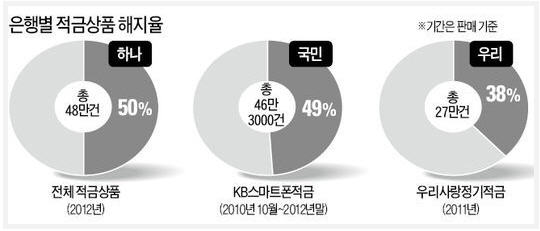 경기회복이 지연되면서 정기 예/적금 상품에 가입했다가 만기까지 기다리지 못하고 중도해지하는 사람이 늘고 있다. 가계의 가처분 소득이 정체된 가운데 금융상품들의 이자 매력도 크지 않은 탓에 적금뿐 아니라 예금을 해지하는 사례도 증가하는 추세다. 금융권에 따르면 각 시중은행을 대표하는 적금 상품들의 중도해지율이 적게는 30%에서 많게는 50%에 이르는 것으로 조사됐다. 중도해지율은 적금 상품에 가입해놓고 만기 전에 해지하는 비중으로, 최대 10명 중 5명은 약정 이자도 못 받고 적금을 깨는 것이다. ◆절반은 만기 못 채워 ◆불황으로 저축 여력 떨어져 [박신영, 장창민 기자]