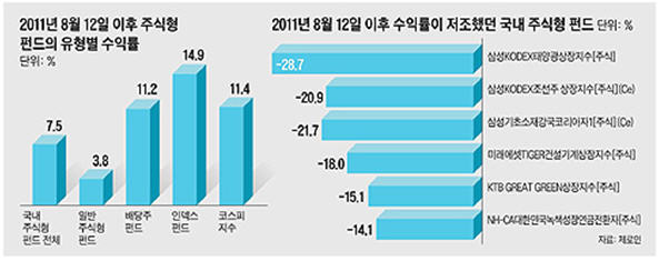 코스피지수가 다시 2000 고지를 넘었지만, 주식형 펀드 투자자들은 아직 속이 쓰리다. 코스피지수가 1700 선으로 내려갈 때 지수 반등을 기대하고 뭉칫돈을 펀드에 묻었지만, 생각만큼 수익률이 나오지 않았기 때문이다. ◇지수 내릴 때 펀드에 돈 넣었는데… ◇아무 펀드나 덥석 들어가면 곤란 [온혜선 기자]