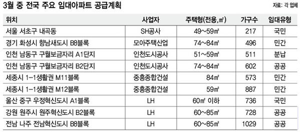 봄 이사철을 맞아 전세난에 시달리는 서민들을 위한 임대아파트 공급이 본격화되고 있다. 다음달 한국토지주택공사(LH)를 비롯해 서울시 에스에이치(SH)공사, 인천도시공사 등 지방공사와 민간 건설업체가 전국에서 7000여가구에 이르는 임대아파트를 새로 내놓는다. 전월셋값 상승으로 허리가 휘는 세입자들에게는 ‘가뭄에 단비’가 될 전망이다. ■ 내곡지구/구월지구에 임대 첫선 다음달 서울/수도권에서는 에스에이치공사의 국민임대, 민간 건설사의 임대아파트, 영구임대 빈집 등 3800여가구가 나온다. ■ 세종시 민간임대 2개 단지 눈길 지방에서는 다음달 세종특별자치시에 민간 임대아파트가 선보이며, 울산, 원주, 나주 등 지방 혁신도시에서는 엘에이치의 국민/공공임대가 나올 예정이다. [최종훈 기자]