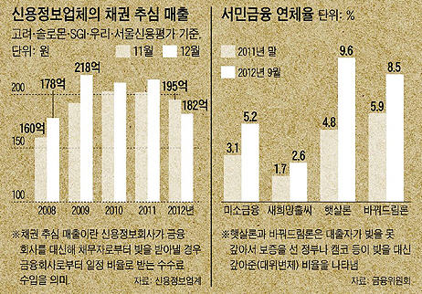 "새 정부가 국민행복기금을 만들어 빚을 탕감해 준다니까 그걸 신청할래요. 그러니 지금은 빚을 갚을 수 없어요." A신용정보의 채권추심원 최모씨는 지난주 빚을 갚으라며 정모(44)씨에게 전화를 걸었다가 이런 대답을 들었다. 채무자 정씨는 은행에서 빌린 아파트 중도금 대출 600만원을 갚지 않고 있는데, 연체 기간이 길어지면서 은행 측이 A신용정보에 채권 추심을 의뢰한 상태다. 정씨가 계속 버티자 추심원 최씨는 "420만원까지 원금을 감면해줄 테니 갚아보라"고 했다. 하지만 정씨는 "새 정부가 들어서면 더 많이 감면받을 수 있으니까 당분간 못 갚는다"며 전화를 끊었다. ◇빚 탕감 공약 기대하고 빚 안 갚아 ◇서민금융도 연체율 상승 ◇2003년 부채 탕감 악몽 재현되나 [손진석 기자, 이종선 인턴기자]