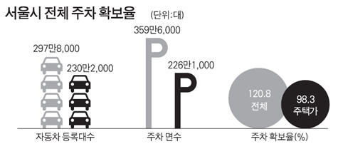 서울시가 심각한 주차난을 해결하기 위해 최근 10년간 126만대의 주차 공간을 늘려 주차장 확보율을 120%까지 끌어올렸지만 주차공간의 양극화 현상은 갈수록 심화되고 있다. 서울시에 따르면 2011년 기준으로 자동차등록대수는 297만8,000대, 주차공간은 359만6,000대로 주차장확보율은 120.8%에 달하는 것으로 나타났다. 수치상으론 61만여대의 주차 여유공간이 있는 셈이지만 다세대ㆍ다가구 주택 등 노후 주거지의 주차난은 갈수록 심각해지고 있는 실정이다. 반면 뉴타운 등 새로 지어진 아파트는 상대적으로 여유가 있는 편이다. 이런 불균형 문제를 해결하기 위해서는 주택에 묶여 같이 거래되는 주차장을 분리하는 주차분리분양제 도입이 필요하다는 주장이 제기되고 있다. 서울연구원 교통시스템연구실의 이창 박사는 "아파트의 여유주차장을 인근 다세대, 다가구 주택 주민들이 임대 및 구입해 활용할 수 있다면 서울시의 154개 동의 다세대, 다가구 주택 승용차의 50% 이상을 흡수할 수있을 것"이라며 "다만 외부인의 출입을 꺼리는 아파트 주민들의 인식 변화가 관건"이라고 말했다. [한준규 기자]