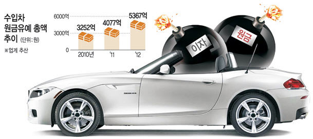 공정거래위원회가 수입차 업체에 대한 강도 높은 조사를 벌이고 있는 가운데 수입차 원금유예 할부 프로그램을 이용한 유예금액이 최근 3년간 1조2000억 원을 넘어선 것으로 추산돼 주목된다. 이에 따라 올해부터 원금상환 만기가 도래하면서 위험수준에 도달한 가계부채의 새로운 뇌관이 될 수 있다는 우려가 제기되고 있다. 원금유예할부제도는 수입차를 구매할 때 차 값의 일부를 먼저 내고 남은 차 값의 이자만 내다가 최종 금액은 36∼60개월 뒤에 한꺼번에 내는 할부 프로그램이다. 유예금 총액은 수입차 모델별 판매가격과 개인고객 구매대수에 유예할부 프로그램 이용률(20%), 유예비율(차 값의 70%)을 산정해 산출한 값이다. 수입차를 살 때 목돈이 필요하지 않게 되자, 경제력이 충분하지 않은 20대와 30대의 구매가 크게 늘어났다. 2012년 수입차 판매량 중 2030세대 비중은 절반(46.4%)에 육박할 정도로 증가했다. [유병권 기자]