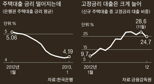 고정금리로 대출을 받아 집을 샀던 대출자가 때 아닌 ‘금리 봉변’을 당하고 있다. 이들은 2011년 하반기 이후 ‘금리 상승을 대비해 금리가 낮을 때 고정으로 묶어놔야 한다’는 금융당국과 시중은행의 권유에 따라 고정금리 대출을 선택했는데 막상 금리가 반대로 움직이는 바람에 금리하락의 혜택을 누리지 못하고 있다. 금융당국이 정책 판단을 잘못해 많은 대출자가 피해를 보고 있다는 지적이 나온다. 조남희 금융소비자원 대표는 “지난해 미국/유럽의 양적완화 정책 영향으로 금리가 내려가는 추세였는데 한국 금융당국만 정반대로 고정금리 정책을 고수했다”며 “결과적으로 소비자는 변동금리 대출을 이용하지 못해 피해를 보고, 고정금리 대출이 커진 은행의 이익만 늘었다”고 말했다. [이태경 기자]
