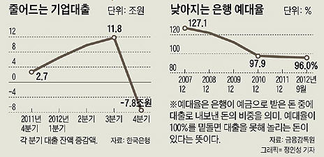 은행, 여윳돈은 많은데 빌려줄 곳 없어 '끙끙'… 기업이 甲, 은행이 乙로 관계 역전 / -대부계 물 좋다고? 이젠 '옛말' / 100만원 예금 들어오면 3만원은 대출 못해 그냥 썩혀… 기업대출 석달새 7조8000억 줄어 / -은행, 거액 예금 오면 "못받아" / 대출금 연장 위해 기업에 '읍소' 기업에 예금 강요 '꺾기'도 사라져 / 그래도 비우량 기업은 자금난 / 한국은행에 따르면 금융기관이 기업에 대출해 준 돈은 작년 4분기 석 달 동안 7조8000억원이 감소했다. 기업 대출이 줄어든 것은 2010년 4분기 이후 2년 만에 처음이다. 신규 대출을 안 받거나 기존 대출을 갚아버린 기업들이 많았다는 의미다. B은행 지점장은 "여윳돈 있는 기업들이 마땅한 투자처를 발굴하지 못한 상태에서 이자 부담이라도 덜자는 생각으로 은행 대출부터 갚는 경우가 많다"며 "경기 전망이 불투명하기 때문에 앞으로 대출 감소 현상이 더 심해질 것"이라고 말했다. [금원섭 기자]