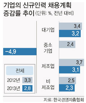 올해 중소기업의 신규 일자리는 지난해보다 줄 것으로 조사됐다. 그 여파로 고용시장에서 대?중소기업 간 양극화가 더욱 뚜렷해질 것으로 우려된다. 한국경영자총협회(이하 경총)는 전국 435개 기업을 대상으로 설문조사한 결과 올해 신규인력 채용은 전년보다 소폭 늘어 2.8% 증가할 것으로 나타났다고 7일 밝혔다. 이 중 대기업은 3.2% 늘릴 계획인 데 반해 중소기업은 오히려 4.9% 줄일 것으로 조사돼 양극화가 두드러졌다. [황계식 기자]