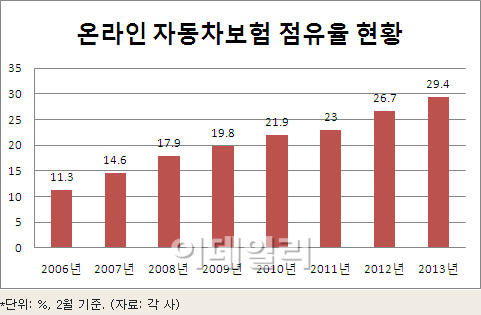 온라인 자동차보험이 출범 13년 만에 점유율 30% 돌파를 눈앞에 두고 있다. 경기가 어려워져 소비자들이 저렴한 보험을 선호하고 있는데다 대형 보험사들이 잇따라 시장에 진출하면서 보상과 긴급출동 등 서비스는 동일한 반면 가격은 저렴한 다이렉트 보험에 대한 신뢰도가 높아졌기 때문이다. 시장의 규모가 갈수록 커지고 있는 만큼 손해보험사 간 경쟁 또한 더욱 치열해지는 분위기다 [신상건 기자]