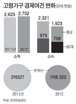 50대 이상 실질 자산가치 2년새 10%이상 하락… 집값 하락?증시 침체로 / 고령일수록 소비 줄여 80대는 28%나 감소… 건강보다 돈 걱정 더해 / 고령층 가구의 2011년 순자산 규모가 2009년에 비해 10% 이상 감소했다. 2010년 이후 진행된 집값 하락 등 '자산 디플레이션' 충격 탓이다. 이에 따라 실제 소득은 크게 줄지 않았는데도 소비지출은 20~30%가량 감소하는 등 노년층 전반이 극도의 내핍생활을 하고 있는 것으로 조사됐다. [조철환 기자]