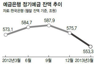 시중은행 수신에서 가장 큰 비중을 차지하는 정기예금 잔액이 두달 연속 감소세를 나타냈다. 한국은행이 내놓은 ‘3월 금융시장 동향’을 보면, 예금은행의 정기예금 잔액이 3월 말 현재 553조3000억원으로 전달보다 2조5000억원이 줄었다. 2월에도 2조5000억원이 줄어 두달째 감소세를 이어가고 있다. [박순빈 기자]