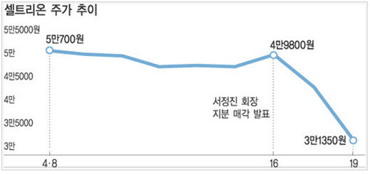 회장이 보유지분을 매각하겠다고 밝힌 지난 16일 이후 셀트리온 주가는 사흘간 37.1% 폭락했다. 이 기간