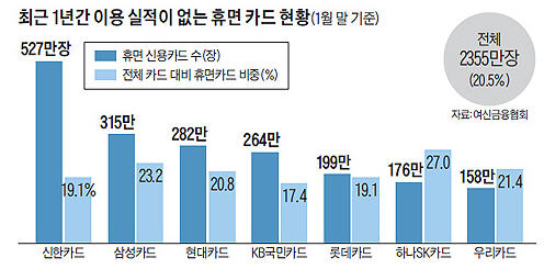 / 휴면카드 2355만장 - 전체 카드의 20% 수준 / 카드 1개 발급에 4~5만원… 1兆 안팎 돈