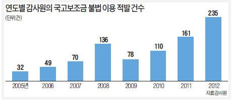 ‘눈먼 돈’으로 전락하고 있는 것. 22일 감사원에 따르면 지난해 국고보조금 불법 운용으로 적발된 건수는 총