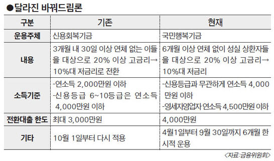 이달부터 20%이상의 고금리를 평균 10%로 전환하는 바꿔드림론의 신청 기준을 6개월 한시적으로 완화했다.