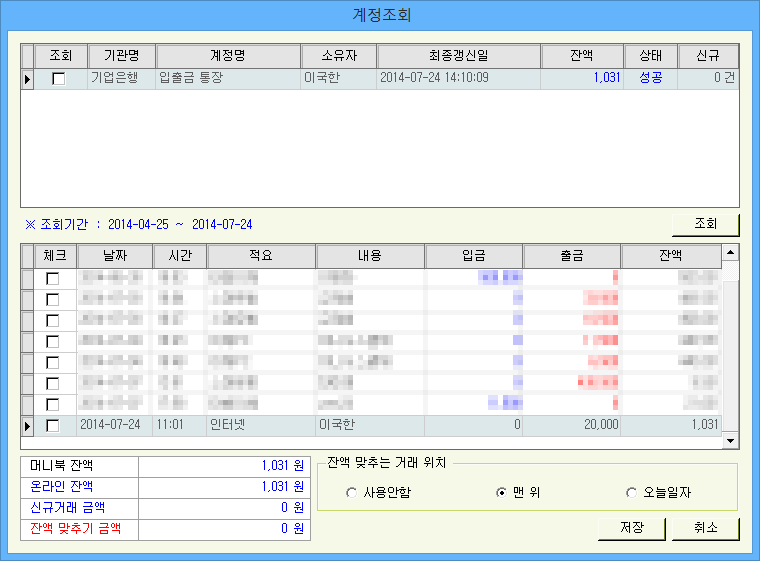 오프라인 입금/출금 추가로 \37,000원을 입력하면 \1,031원으로 맞출 수는 있으나 계좌 조회를 하면 차액이 \37,000원